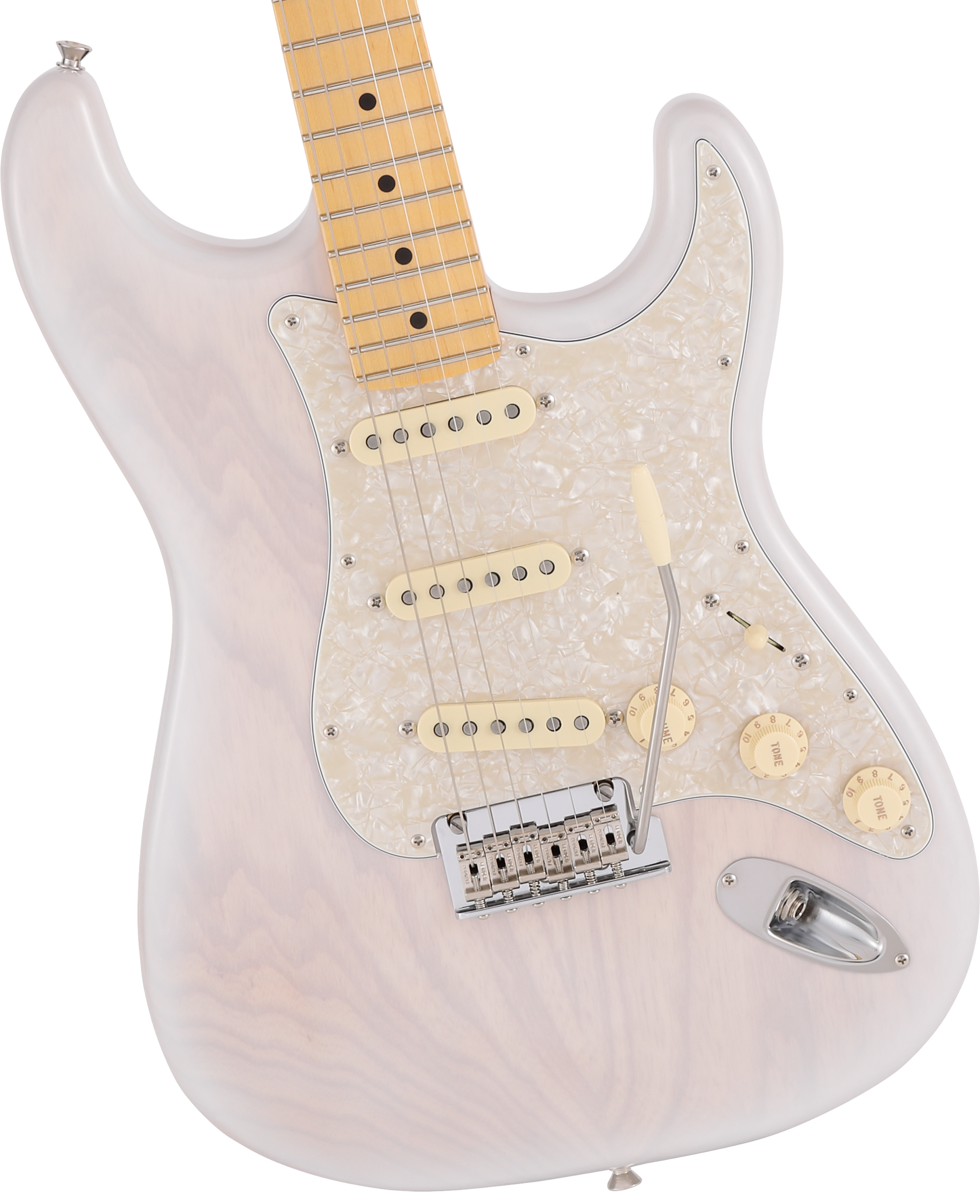 The Fender Made in Japan 2019 Limited Edition Collection Stratocaster MN White Blonde combines authentic vintage vibes in look and sound with modern details in playability. Following the classic '50s style, Fender uses an ash body, whose grain remains visible through the transparent white finish, the bolt-on maple neck is comfortable to play thanks to its "Modern C" profile. With three Fender Custom '69 single-coils, the Fender Made in Japan 2019 Limited Collection Stratocaster delivers premium vintage sounds ranging from funk, blues and rock, with a crisp dynamic and harmonic presence that can be heard throughout the band mix. Last but not least, a Fender 2-point synchronized tremolo and vintage style locking tuners complete the Fender Made in Japan 2019 Limited Collection Stratocaster MN White Blonde.