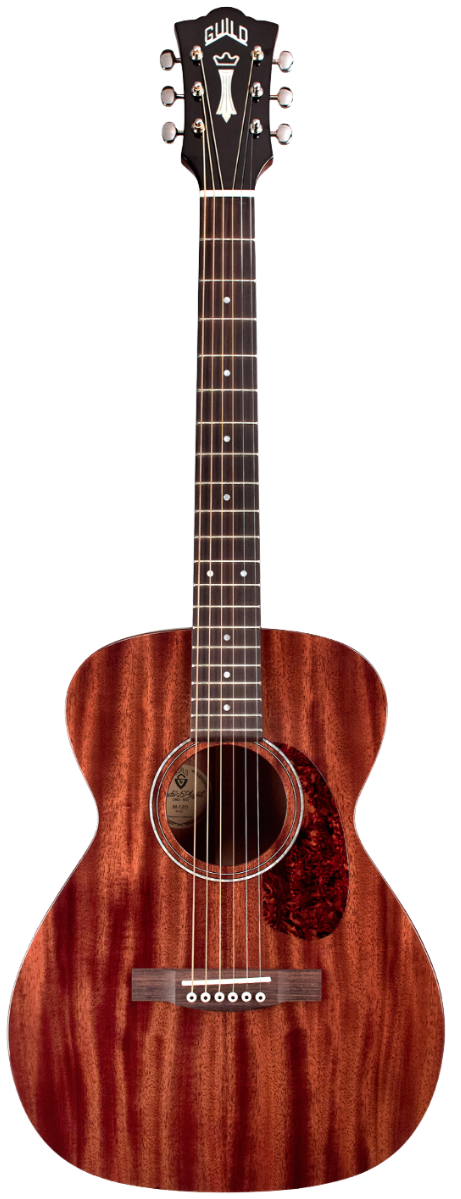 With its comfortable body and distinctive voice, the M-120 provides excellent balance and a delicate tone. Built with solid African mahogany top, back and sides, the M-120’s 24 ¾” scale length and 1 ¾” nut width on a vintage shaped Guild neck make this concert size guitar easy to play. The M-120 features a rosewood fingerboard and bridge, bone nut and saddle, mother-of-pearl rosette, and period-correct tortoiseshell pickguard. This model also showcases Guild’s iconic Chesterfield headstock emblem reminiscent of 1960s Guilds, and includes Guild’s new premium acoustic gig bag. Available in Natural gloss finish.